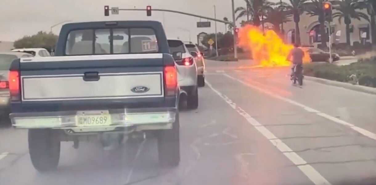 【ガソリンに引火?】車とバイクが衝突した瞬間に道路が大炎上して大騒ぎ
