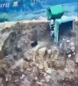 【マヌケな事故】岩の運搬中のトラックが重さに耐えれず奈落の底に落ちていく映像