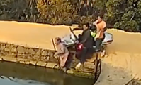 【3人まとめて池ポチャ】2人乗りのバイクが動物にビビっておばあちゃんと一緒に池にダイブ
